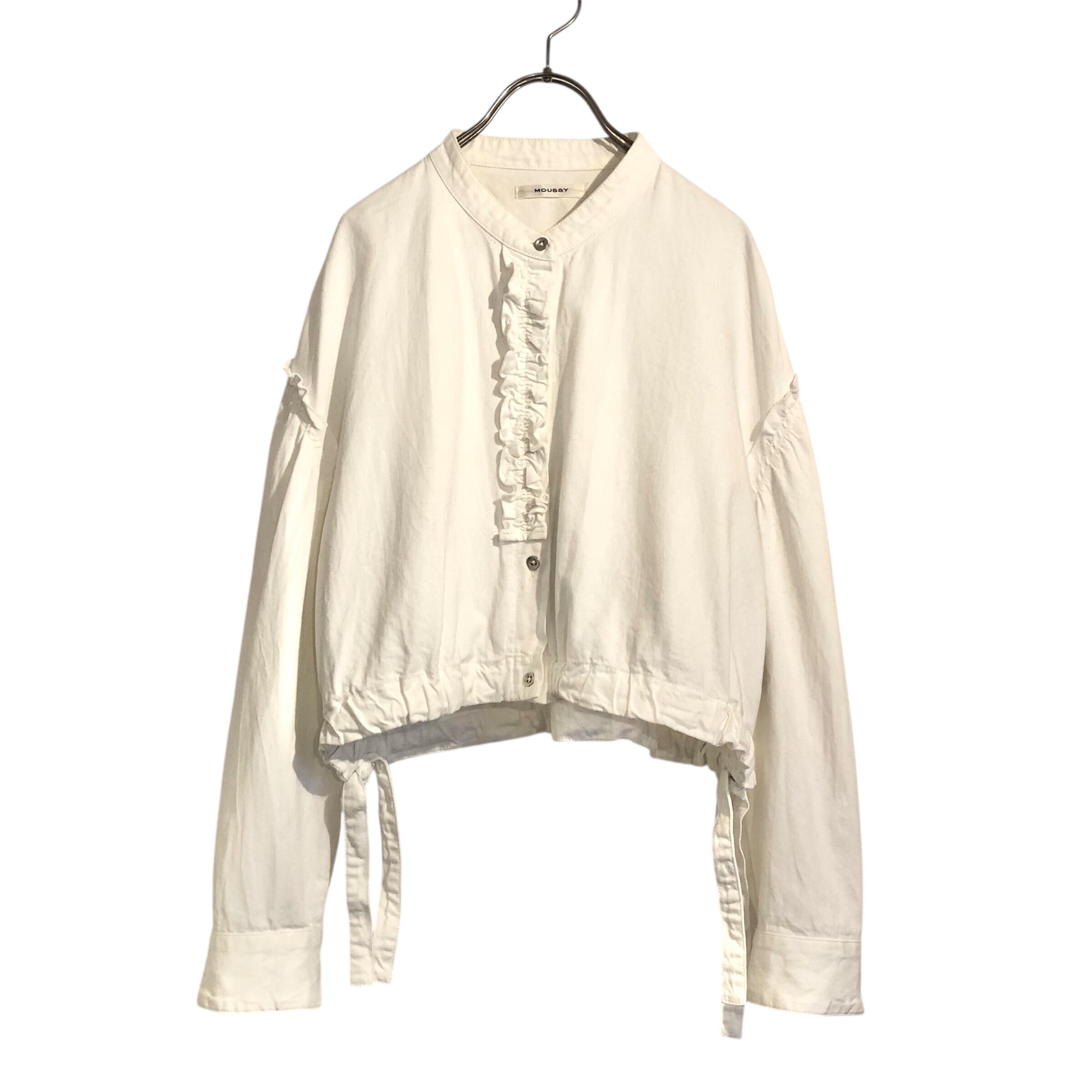 フリルに銀ボタンが可愛い☺︎ サイドのリボンで裾が絞れるようになってます。 デニム素材なので羽織にも良いですね。 着丈47.肩幅55.身幅65.袖丈50cmほど